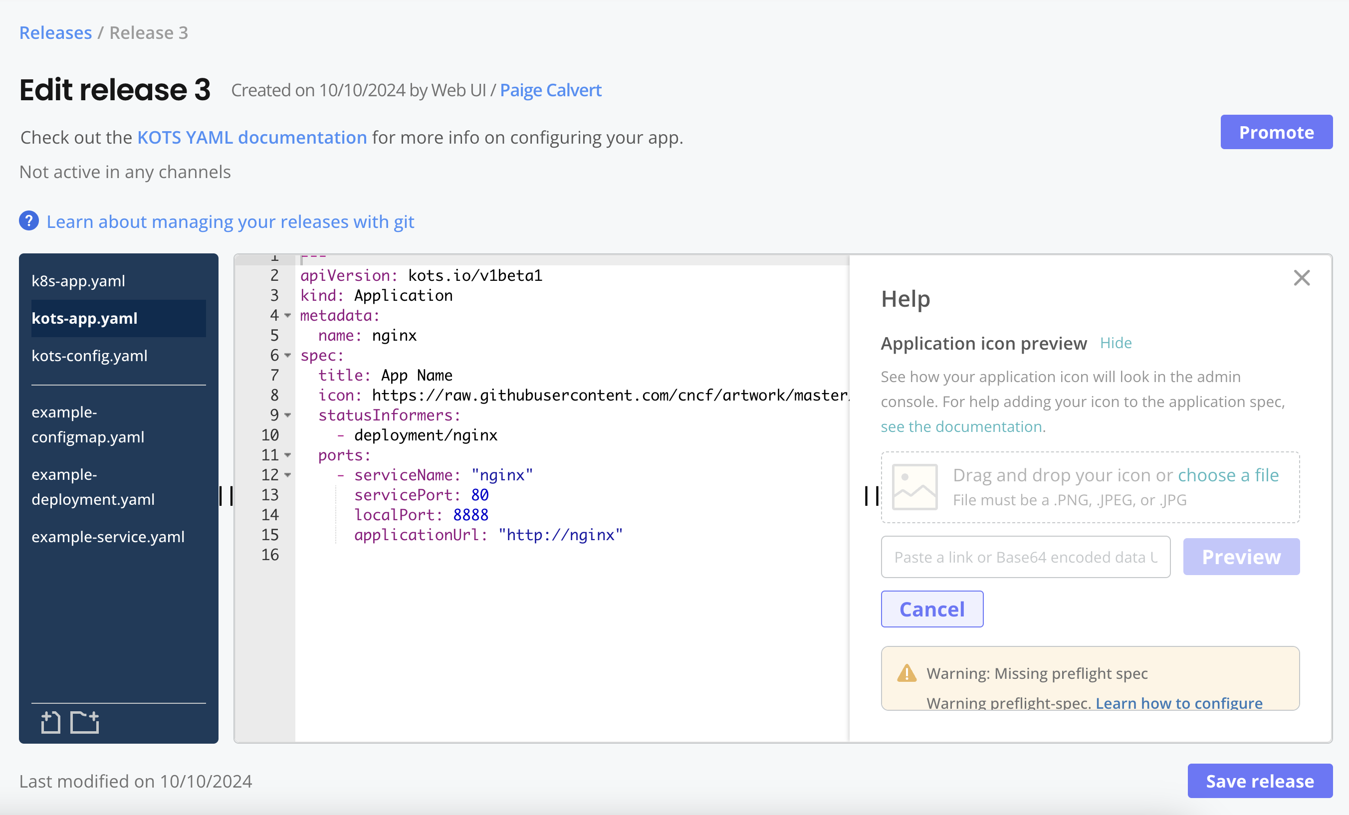 .tgzfile to a release. For more information, see Manage Releases with the Vendor Portal or Managing Releases with the CLI. -
